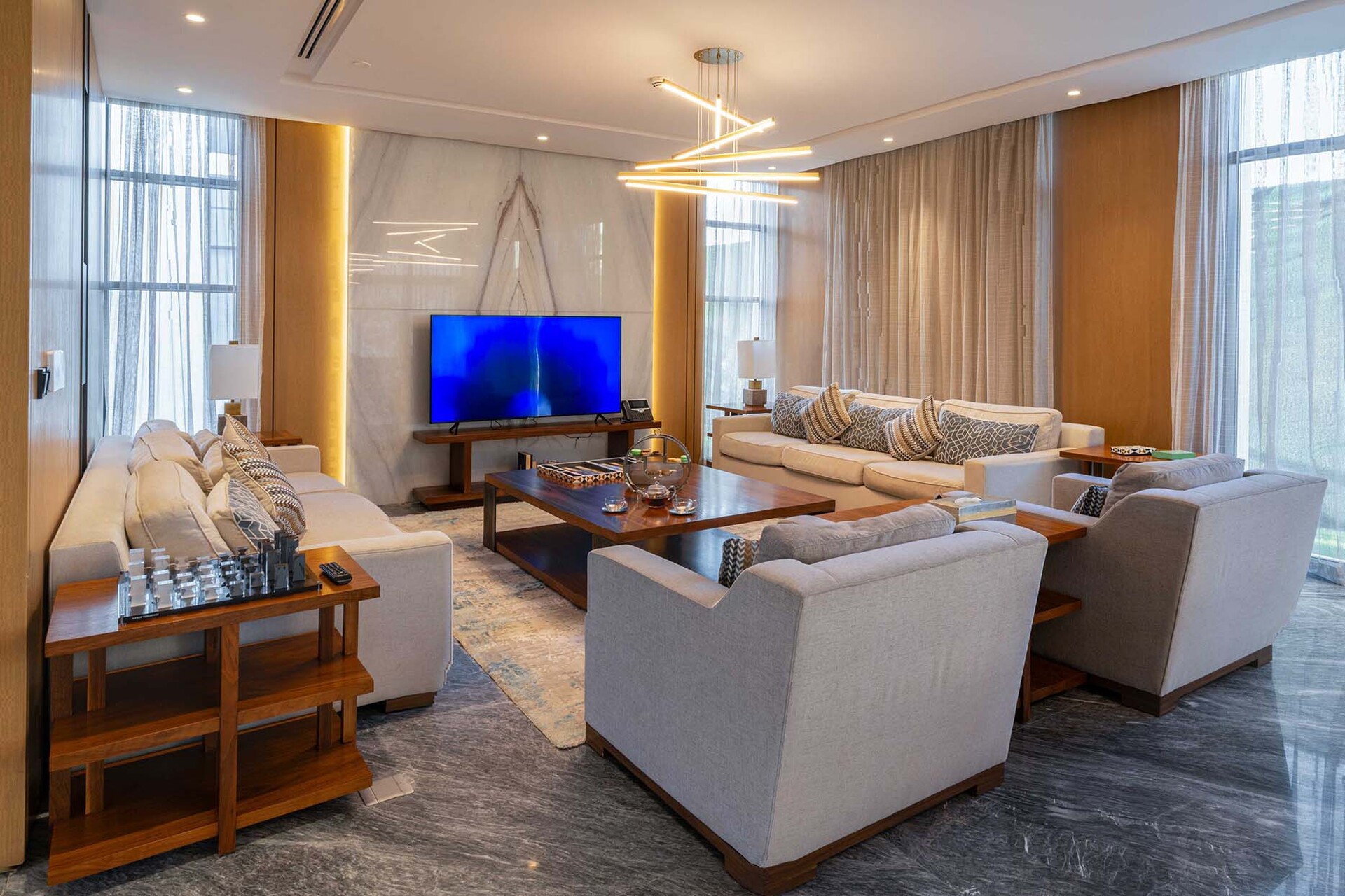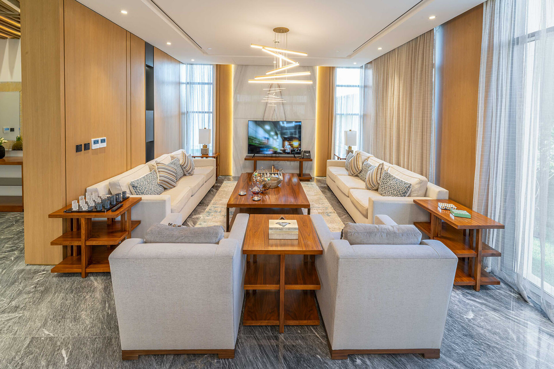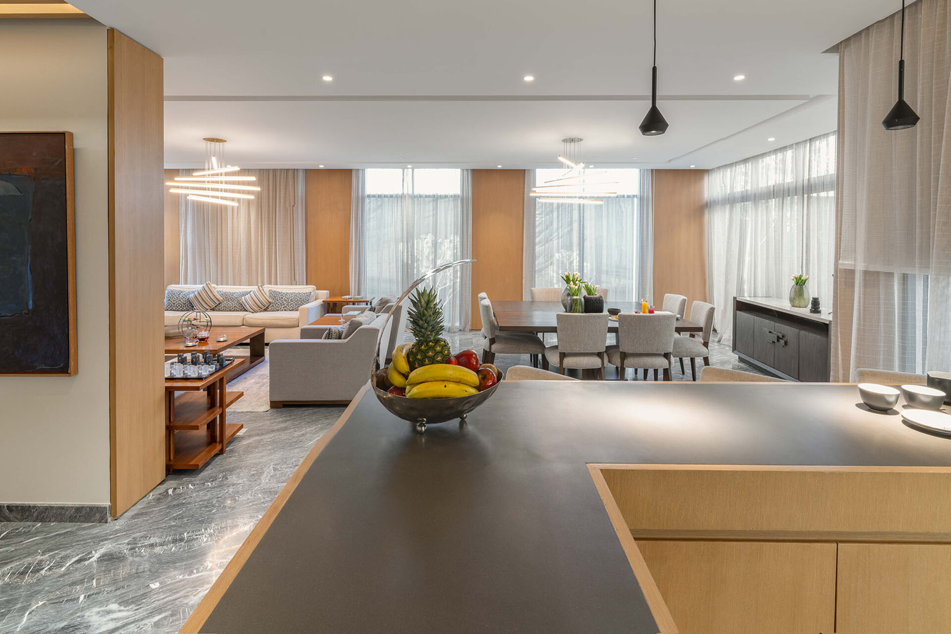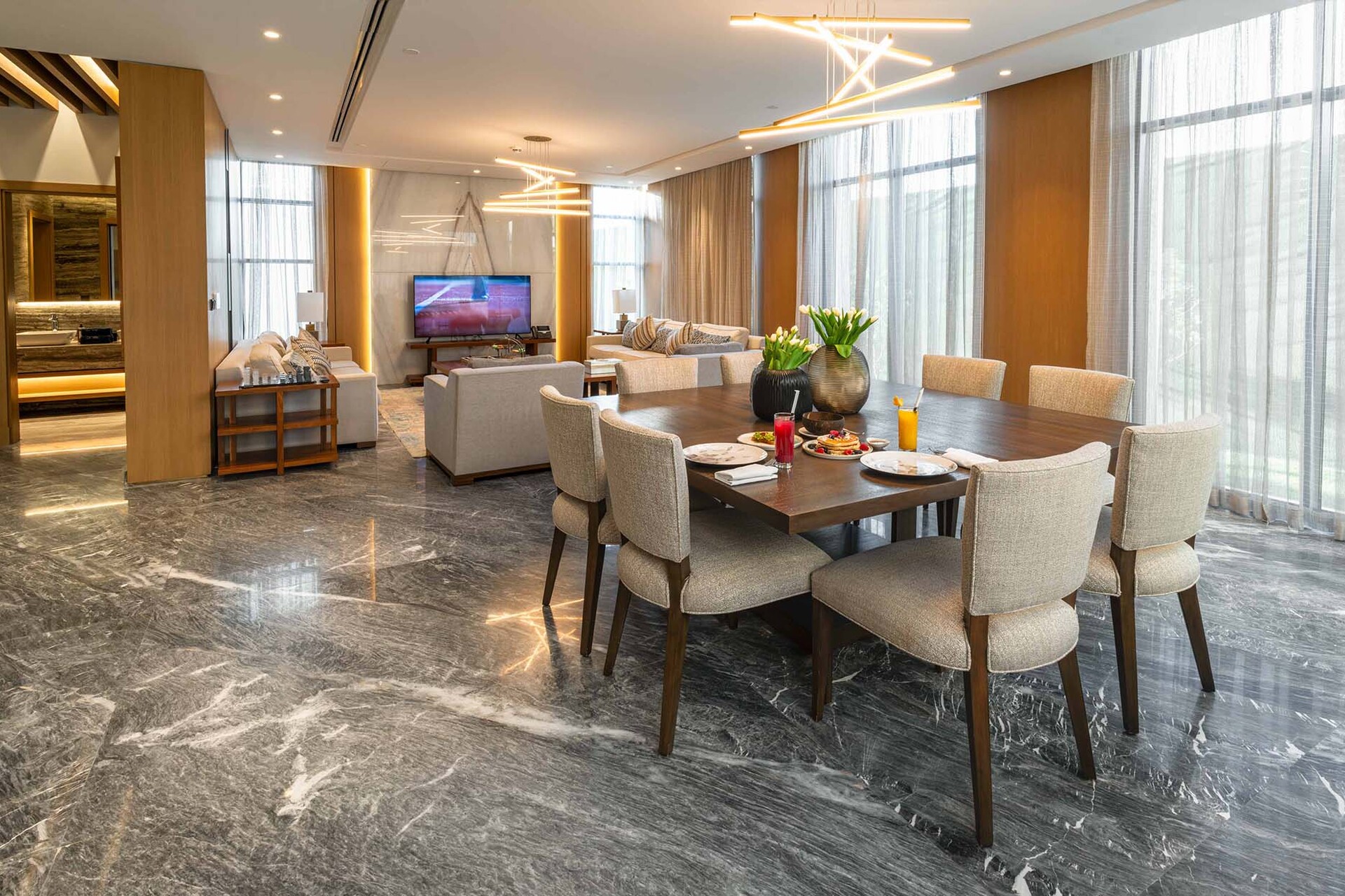 Featuring premium Italian marble flooring and cladding, elegant wood wall finishes, and high-pressure engineered wood flooring in bedrooms — every detail is crafted for timeless sophistication.
